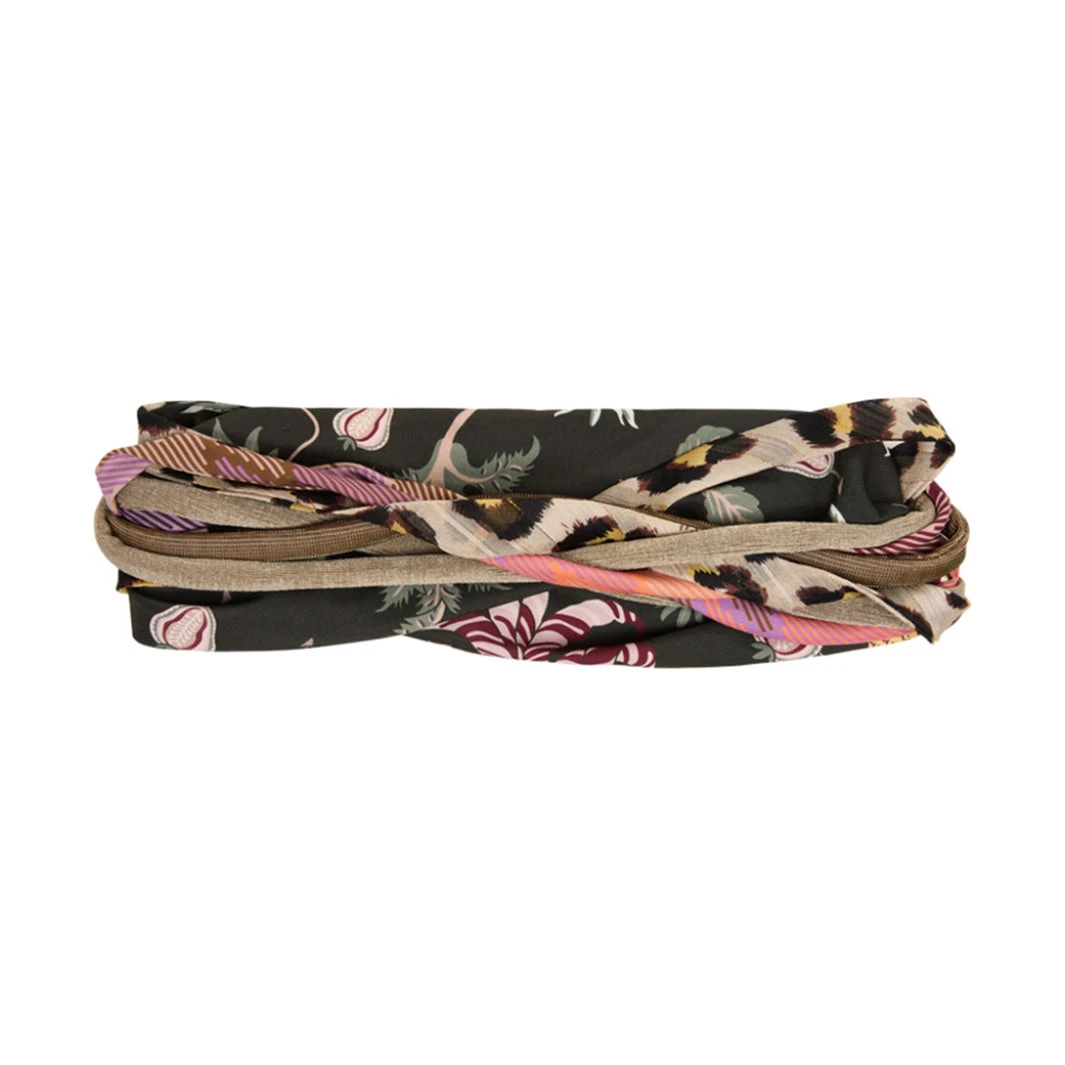 The Christine Boho Headband is a great addition to your headwear wardrobe. It is a light and comfortable accessory, easy to fit and has endless styling options. The Exotic Garden print has a lovely mix of earthy and pink tones. You can wear the Boho headband on it’s own or layered on top of a turban, as pictured with the Yoga turban.