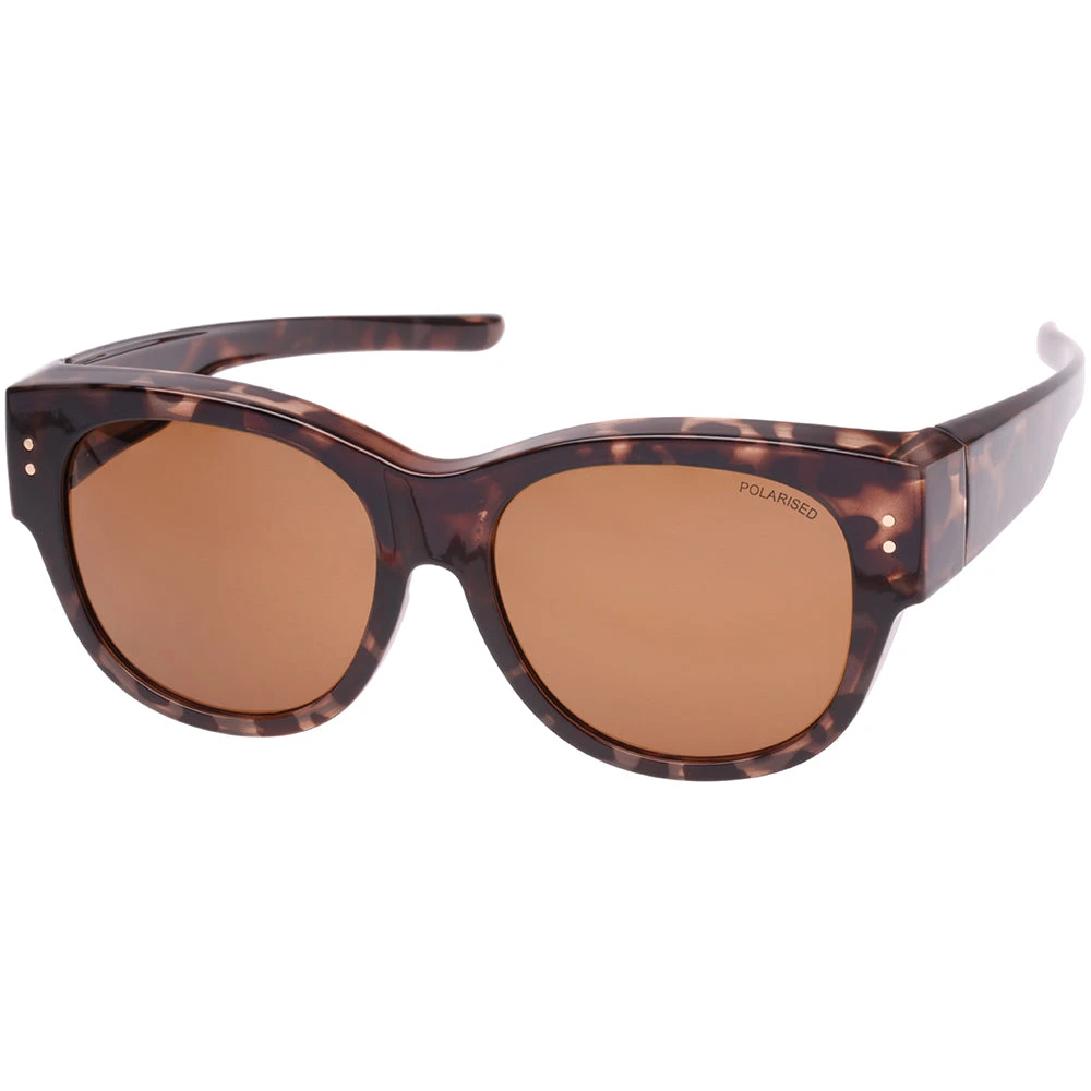 Honeysuckles is a modern wrap style designed to fit over your glasses, featuring gold metal rivets. Honeysuckles in dark tortoiseshell is fitted with brown polarised lenses for ultimate sun protection.