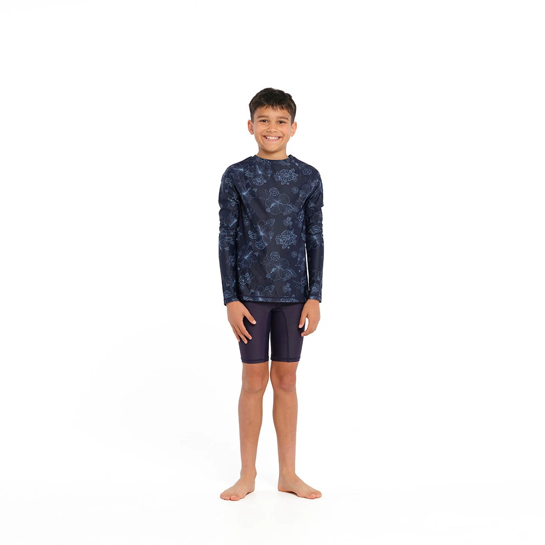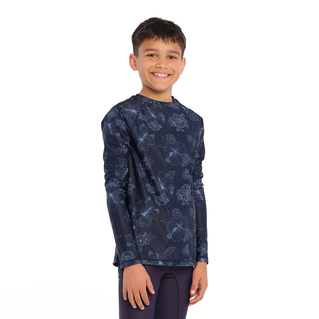 Our Kids Blue Bay Floral Long Sleeve Rashie is an ideal choice for beach and pool trips during the warmer months. Its long sleeve design features maximum UPF50+ protection, and its flexible fabric ensures comfort. When used together with our Swim Shorts or Board Shorts, this Rashie forms a stylish ensemble.