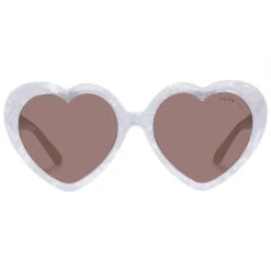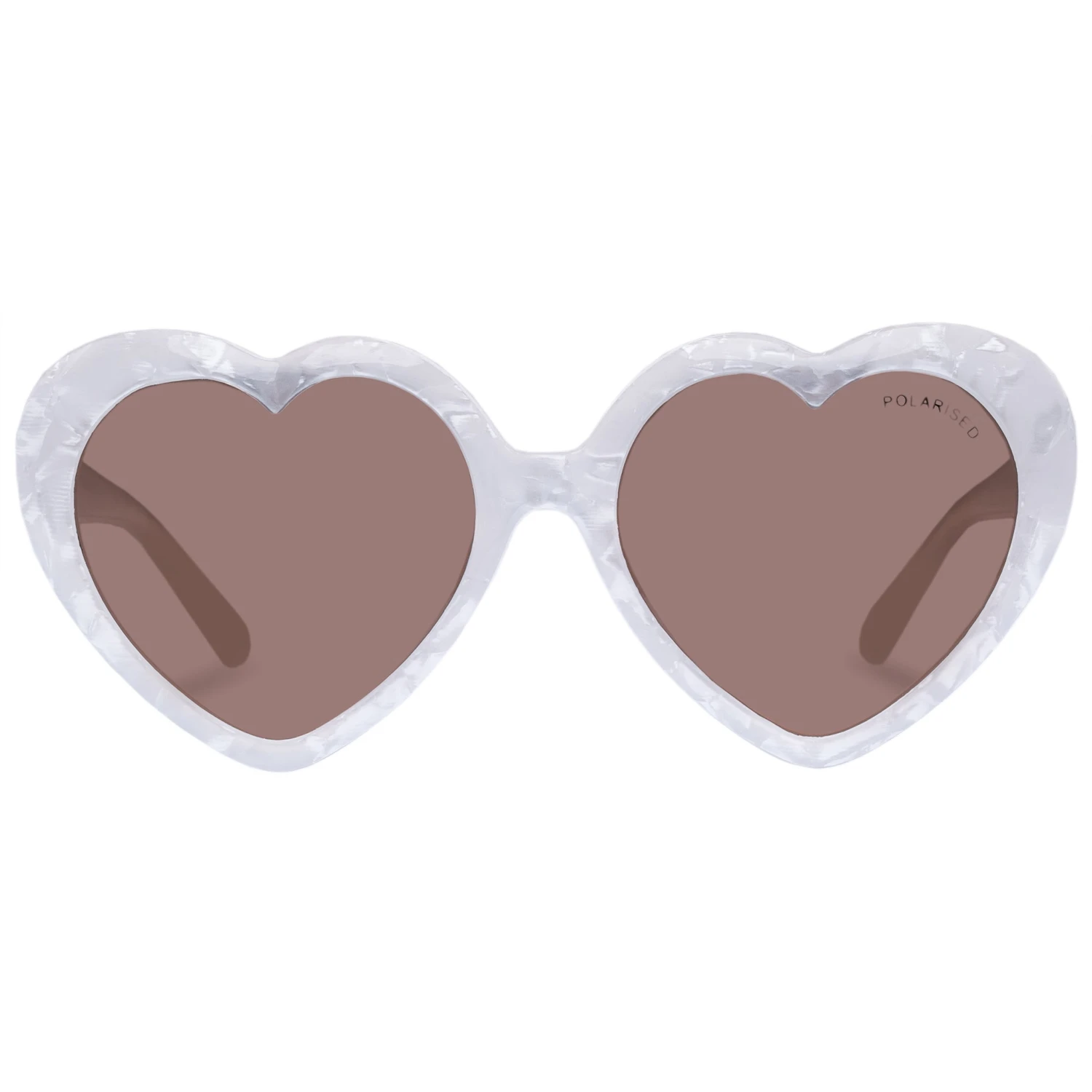 Lovebird Sunglasses in Ivory Seashell are stylish heart shaped frames for children aged 5-8. Made with a chic milky ivory colour and pearl shell transfer, these sunglasses also feature brown polarised lenses for superior protection and clarity of vision.