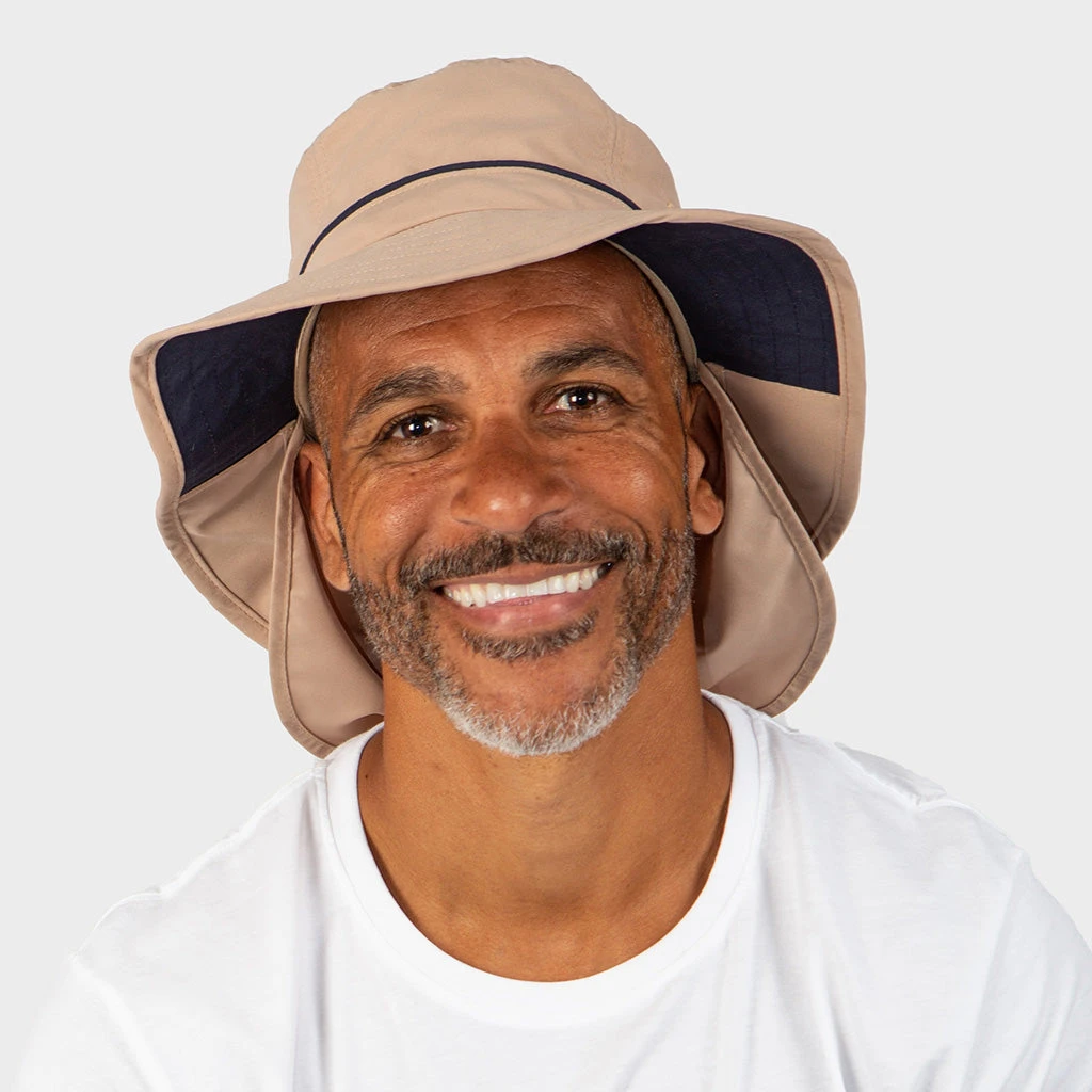 The men’s lightweight Marvin Bucket sun hat is the ultimate in UV-protective design. The reveal or hide neck flap provides all over coverage, with additional ventilation rivets to increase air flow keeping you cool for all day comfort. Made of versatile quick drying microfibre in Beige with contrasting Navy under the brim. The Marvin Bucket has your UPF50+ sun protection needs covered.