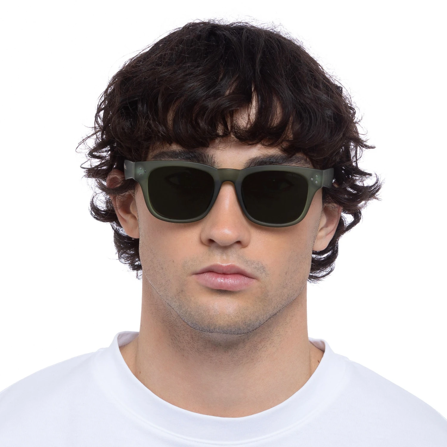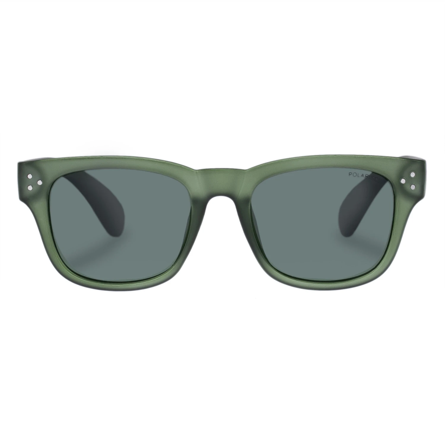 Noddy Youth Sunglasses are unisex and have a small rectangle frame shape. Crafted from a matte khaki frame colour with silver rivets, these sunglasses offer clear vision, providing protection from harsh glare thanks to its khaki polarised lenses.